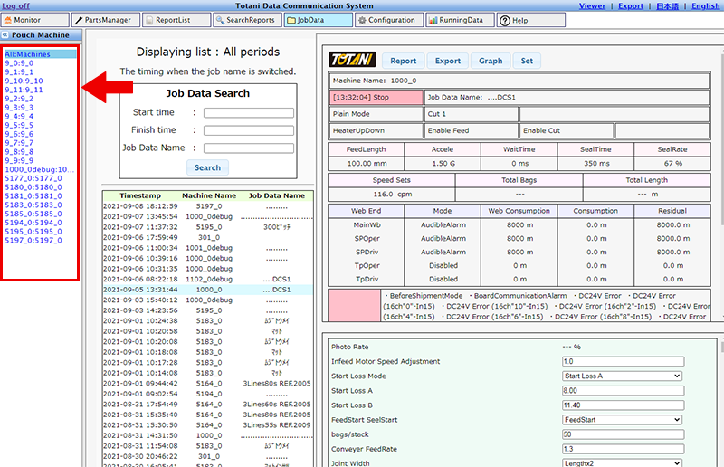 By clicking the "All Machines" button on the left side of the screen (in the red border), you can view and confirm the pouch making conditions used by each pouch making machine on that day.