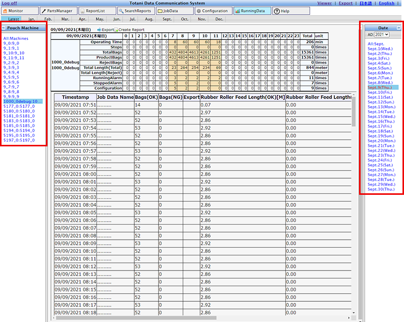 An effective function for managing operation data is the "Export (data output)" function. The "Export" button is located in the header navigation of the screen or in the pouch making machine status check screen of the monitor (top screen). Clicking this button displays the data export screen.