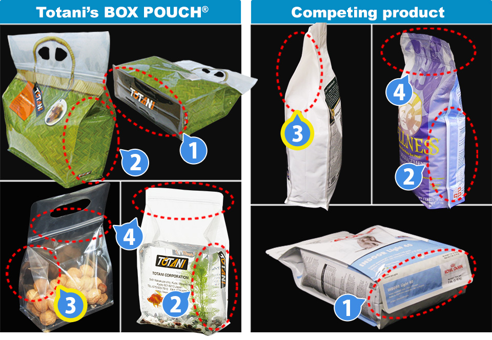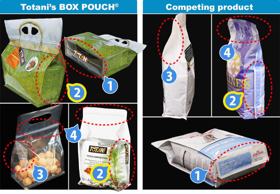 - 3In the structure (design) of Totani's own 45-Degree Angle Folded Gussets, content is easy to take in and out, compared to other Flat Bottom Pouch.
