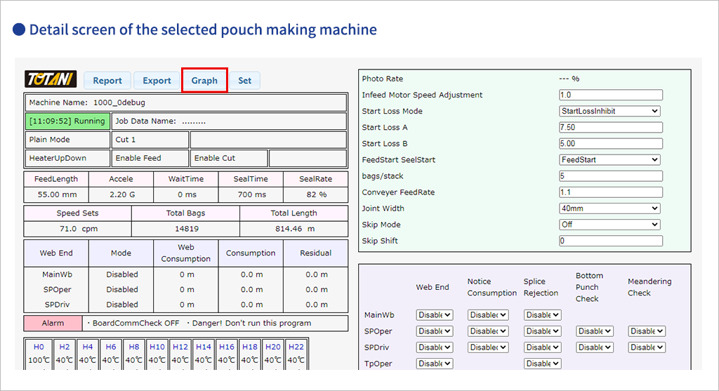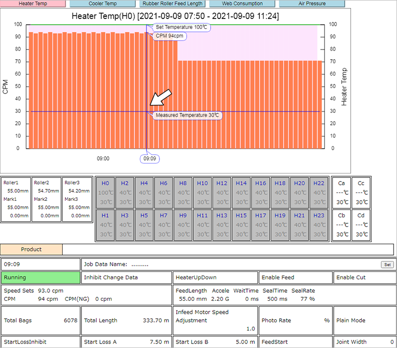 Right side screen of detail screen displays the current pouch making conditions for the selected pouch making machine. Important settings such as the servo operation status of the roll film section and cutter, heater temperature settings, etc. can be checked (* in blue border).