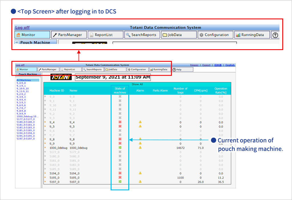 The current operating status (number of bags made per day, operating rate, and current shot count) of all pouch making machines connected to the DCS can be checked.