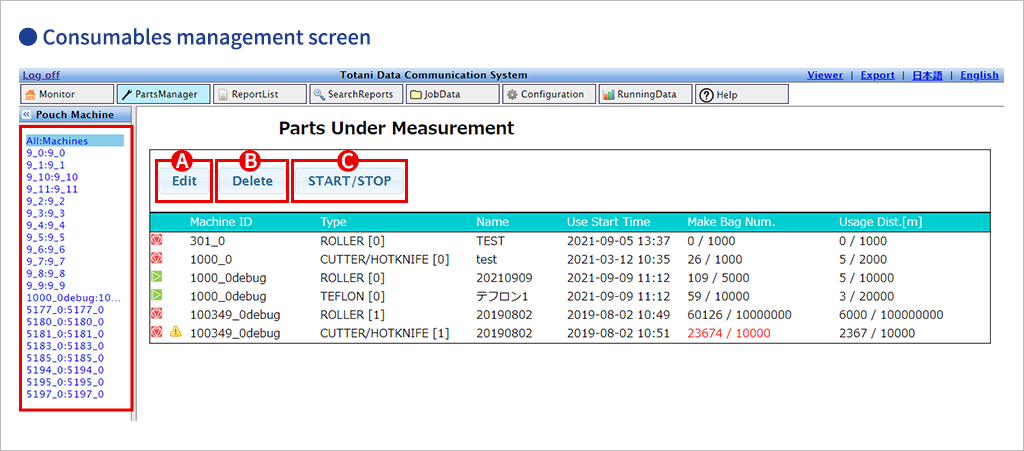 Selecting the "Parts Management" tab on the monitor (top screen) displays the "Parts Management" screen for the parts to be measured, as shown in the figure above. Here, you can measure the number of pouches made using the parts on the selected pouch making machine, as well as the distance of raw materials used.