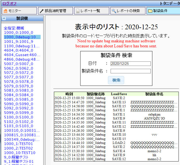 Furthermore, by specifying a pouch making machine, you can check the Load/Save information of the pouch making conditions set by that machine.