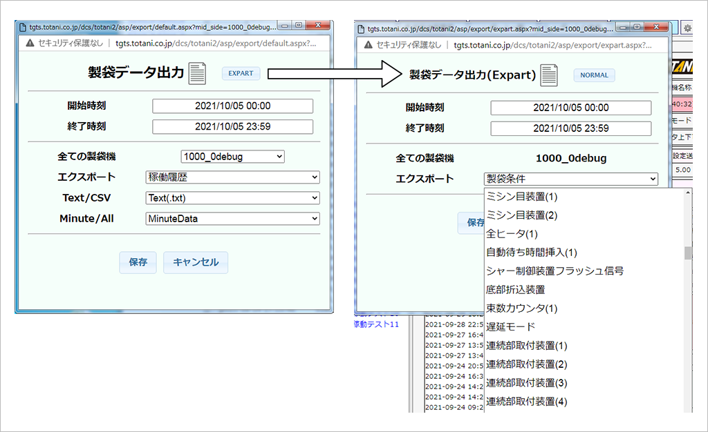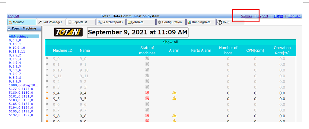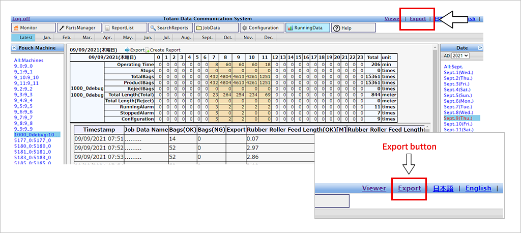 An effective function for managing operation data is the "Export (data output)" function. The "Export" button is located in the header navigation of the screen or in the pouch making machine status check screen of the monitor (top screen). Clicking this button displays the data export screen.