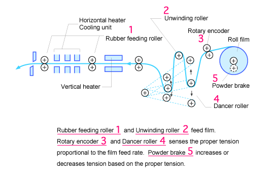 The film rate is detected by a Rotary encoder, and a potentiometer detects the position of the Dancer roller moving like a pendulum relative to the reference point. The signal from the potentiometer controls the Powder Brake. When the film rate is increased, the brake is applied a little. When the position of Dancer Roller is lower than the reference point, brake is strengthened a little. Thus, proper tension is given to film (see the Figure).